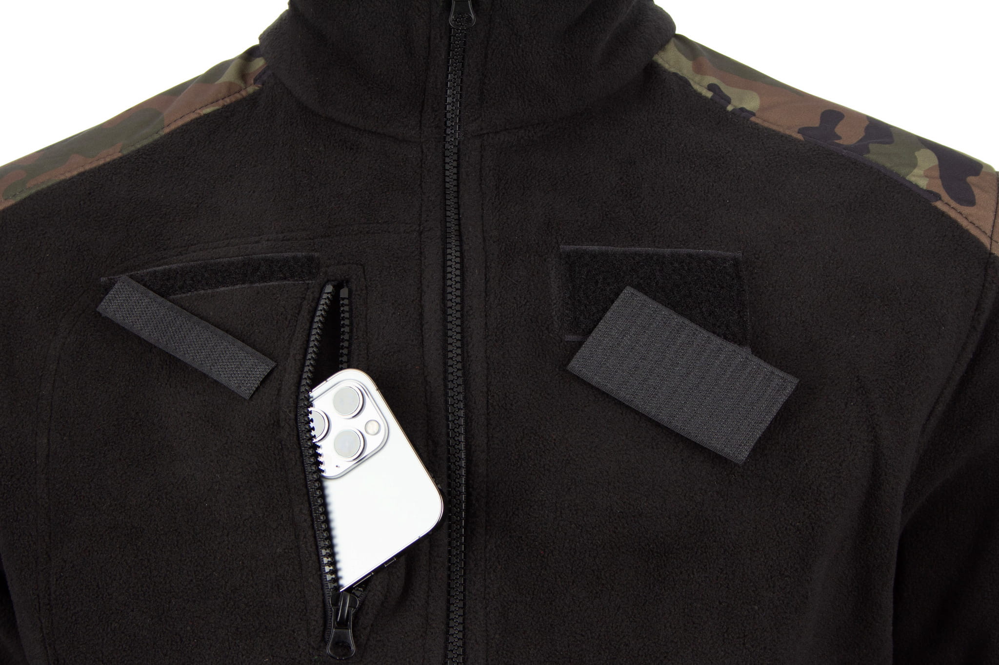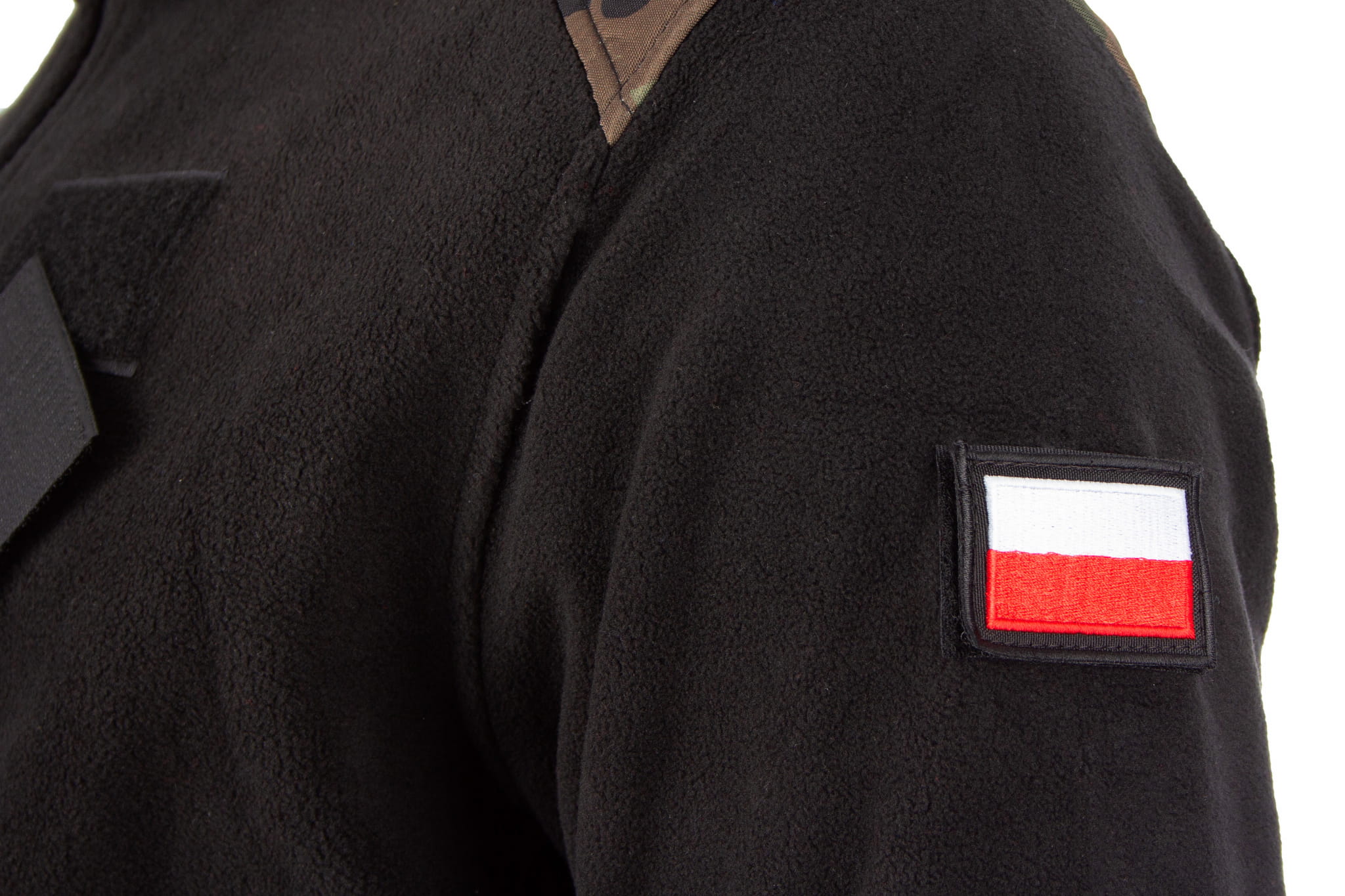 Bluza wykonana jest z polaru w kolorze czarnym. Na łokciach oraz na karczku znajdują się wzmocnienia z ortalionu w kolorze moro.
